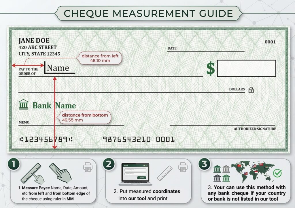 - Printer Alignment: Use our smart offset tool to adjust the text position to match your specific cheque leaf and printer.